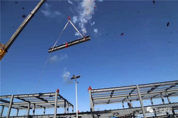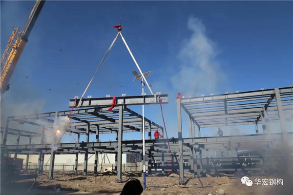 2021年4月3日,8點58分,萬里晴空,施工現(xiàn)場鞭炮齊鳴、掌聲雷動,在華宏人共同見證下,寒地裝配式鋼結構建筑—員工公寓主梁吊裝成功,標志著工程鋼結構主體順利完成,這也是工程項目建設開工以來取得的階段性成果。